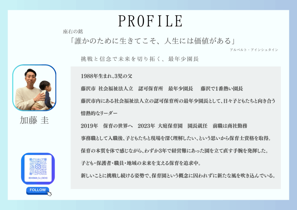藤沢市内の保育園園長。学生時代のDJ活動、保育・幼児教育施設のコンサルタントを経て現職。経営破綻寸前の保育園の再生に成功し、ICT化の推進と、職員・保護者・子どもたち三方の幸福を追求する新しい保育の形を実践している。3児の父でもある。